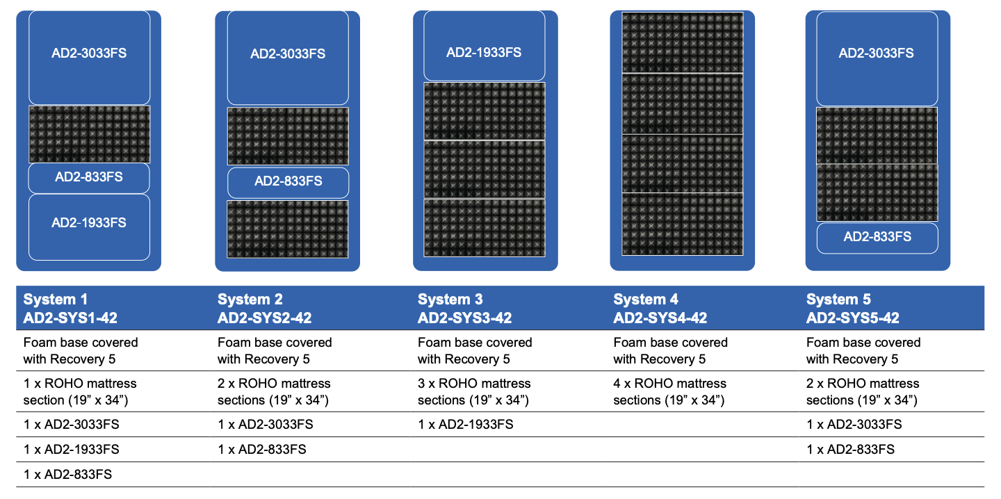 AD2-SYS5-42 ADAPT 2 SERIES SYSTEM 5 PKG. INCLUDES 2 ROHO MATTRESS SECTIONS (19” x 34”) or VICAIR INLAY