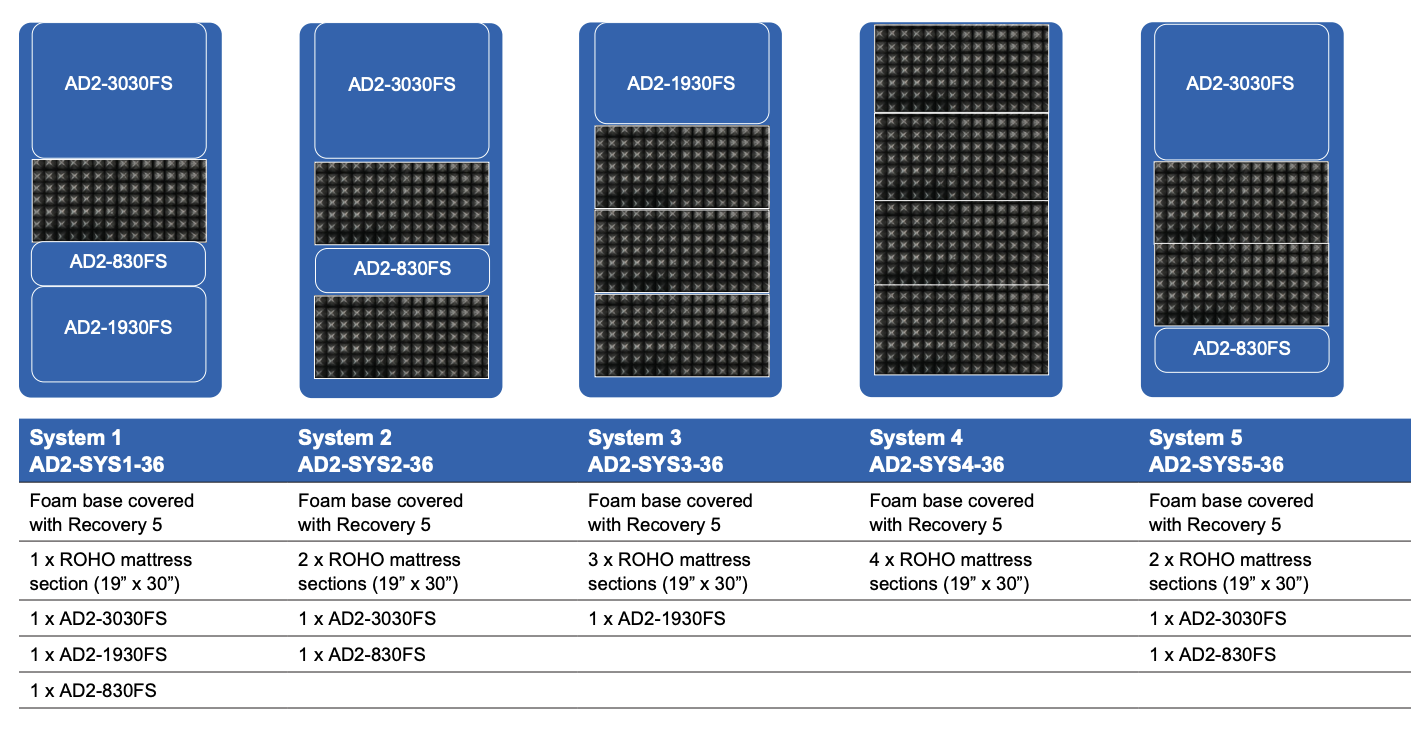 AD2-SYS1-36 ADAPT 2 SERIES SYSTEM 1 PKG. INCLUDES 1 ROHO MATTRESS SECTION (19” x 30”) or VICAIR INLAY