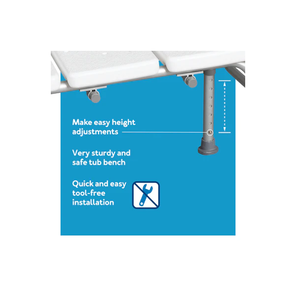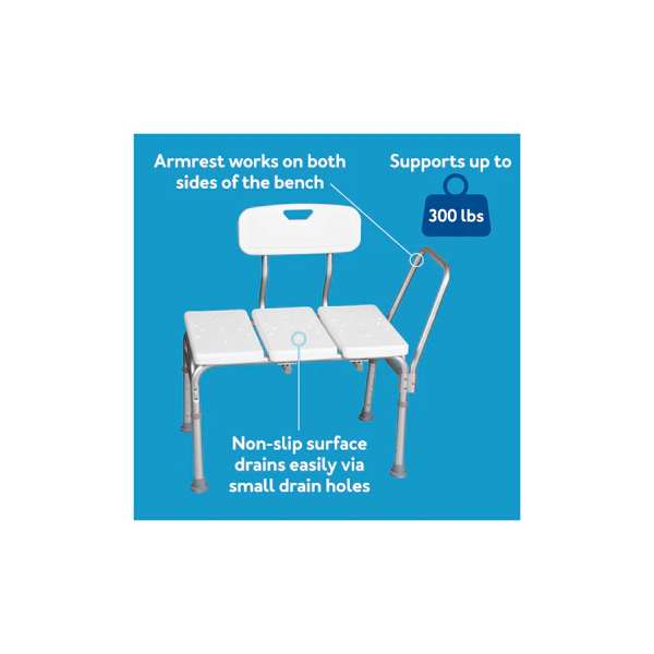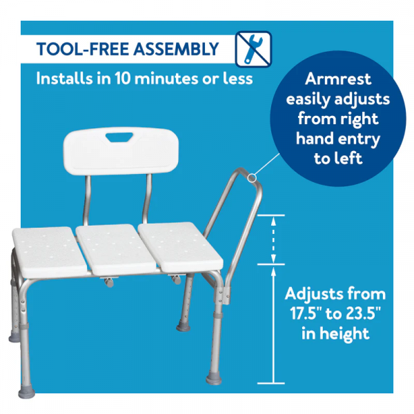 Is an economical and safe option for transferring. This transfer bench features a reversible seat back for left- or right-handed bathing entry and an oversized handle for added safety. Comes standard with an adjustable seat height, a textured, non-slip surface on both the seat and back, and oversized slip-resistant tips for increased stability.