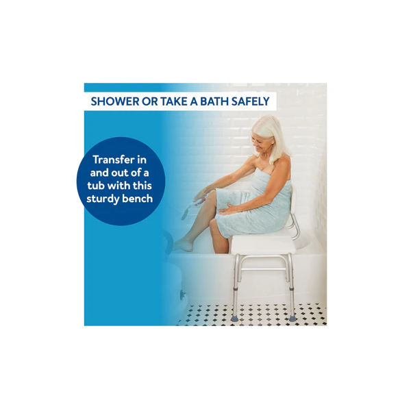 - Tub transfer bench for easy transfer into the shower or bath tub. Bath tub benches add a new level of bath safety and independence. One side of the bath bench sits on the outside of the tub while the other sits inside. This lowers the chances of tripping or falling while getting in and out.