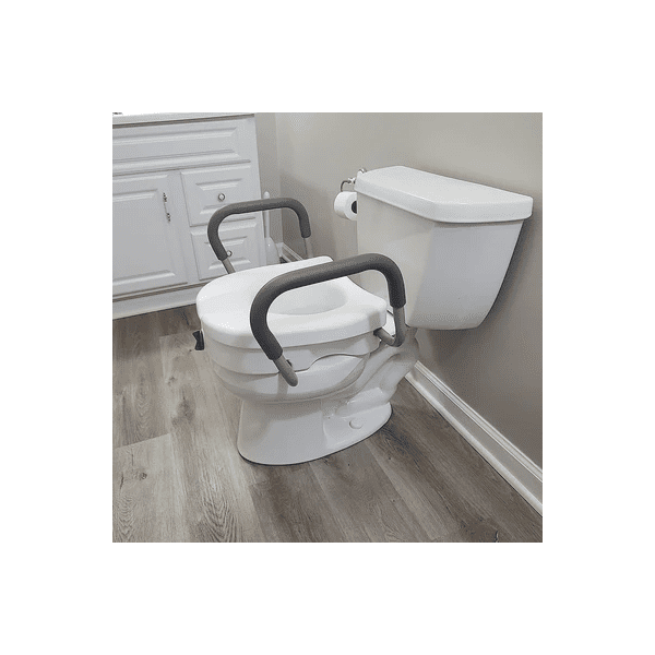 - Comes with padded armrests for comfort and support. The toilet seat with arms adds a higher level of support for those with significant medical or balance issues. This bathroom aid acts as a handicap toilet seat or a toilet seat for elderly persons.