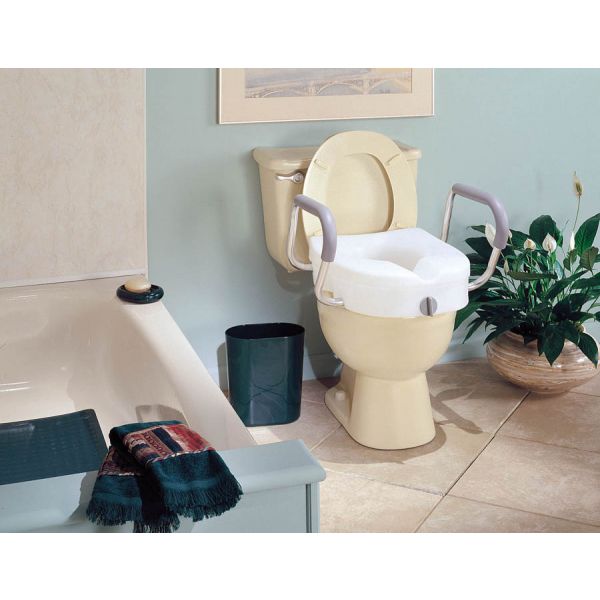 Our E-Z Lock Raised Toilet Seat with Adjustable Armrests adds 5 inches of height to the toilet seat to assist those with bending or sitting difficulties. This model comes with adjustable armrests that adjust from 18 to 20 inches and fits most toilets. The easy-to-use locking mechanism secures the raised toilet seat to the toilet bowl and the smooth contour seat has built-in hand grips for easy handling. This seat is lightweight and easy to clean.