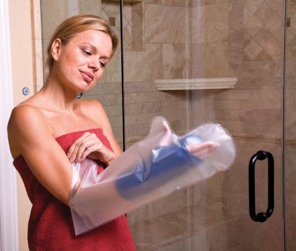 Keep your cast dry while showering. The E-Z Stretch Arm Cast Protector is made from durable, reusable, and latex-free material. The waterproof cast protector to stretches easily over the cast and then self-seal tightly around the arm without straps or tape. This waterproof arm cast cover will not puncture or rip easily, and it can be put on with one hand. The waterproof cast cover fits most adults and children.