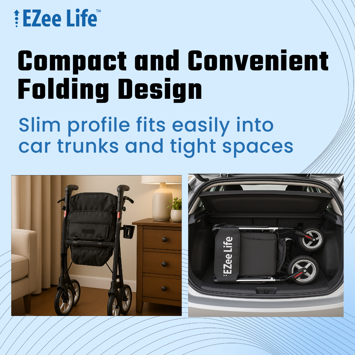 Is designed with user comfort and convenience in mind. Available in two stylish colors, it features an extra-wide, plush cushioned seat, oversized backrest, and adjustable seat and handle height to accommodate individual needs. The heavy-duty aluminum frame provides exceptional stability and support for users up to 400 lbs. Large 10-inch front wheels with 360-degree rotation ensure smooth maneuverability on various terrains, while the convenient storage bag and cane holder add to its practicality. This rollator folds effortlessly for easy storage and transport, making it an ideal mobility aid for both indoor and outdoor use