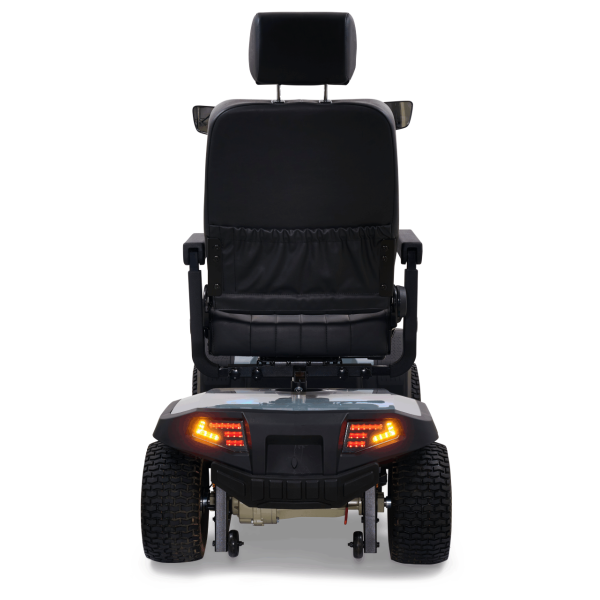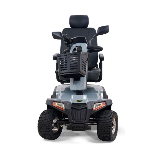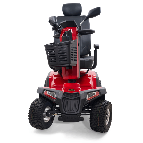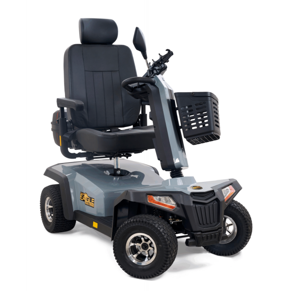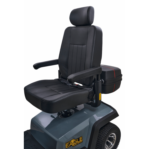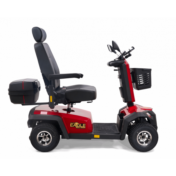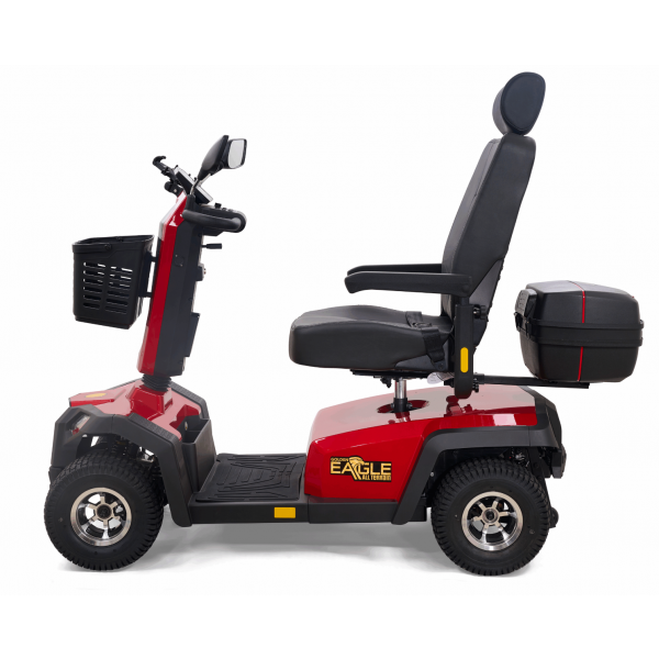 Take your outdoor driving experience to new heights with the Golden Eagle All-Terrain™ scooter. In a class all its own, the Eagle AT’s stylish yet rugged, off-road design is built for superior performance and maneuverability with front and rear adjustable suspension for smoothly traversing outdoor terrain and a powerful 200 Amp controller for outstanding climbing ability. It offers full LED lighting with brake light and turn signals, an infinitely adjustable wraparound tiller, and a reclining, high-back Captain’s seat for maximum comfort, plus durable vibrant red or grey color shrouds for a sporty look. With a 500 lb. weight capacity, 13” pneumatic turf tread tires, up to 34-mile operating range on 75 AH batteries, plus a water-resistant rear carry case for personal items, the Golden Eagle AT offers everything you need to enjoy your next adventure!