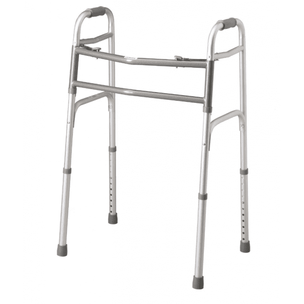 Heavy-duty walker has an aluminum frame with front cross brace and dual side braces for durability