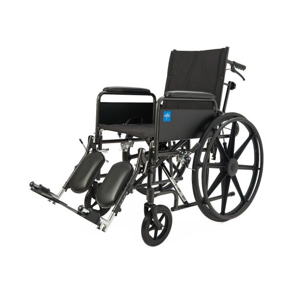 With Full-Length Arms and Elevating Footrests, durable mobility aid with dual axles designed to be pushed by a caregiver has smooth-rolling, solid tires.