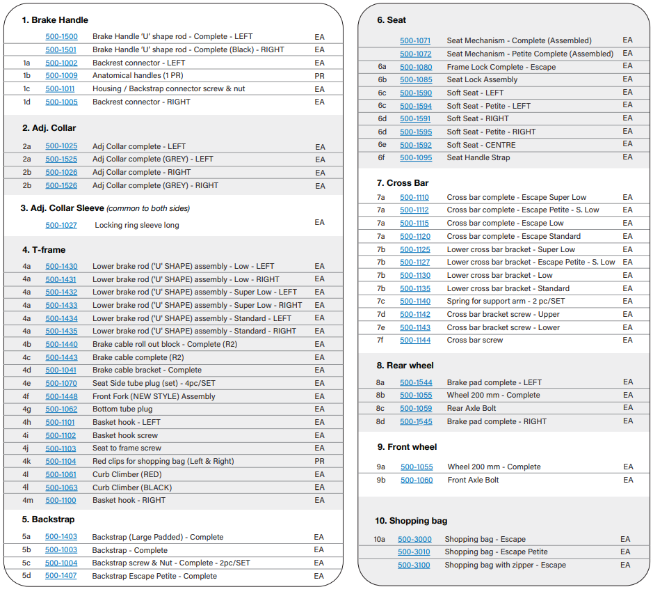 Parts for Escape Standard and Petite Rollators by Triumph Mobility