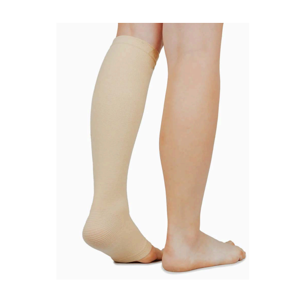 - Below Knee Compression Stockings are made from high-quality dermophilic soft nylon yarn and spandex material; the stockings are highly stretchable and durable.